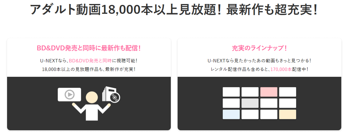 その作品数は120,000本以上。U-NEXTに加入するだけでアダルト動画以外にも映画やドラマが楽しめるので、非常にオトクです。